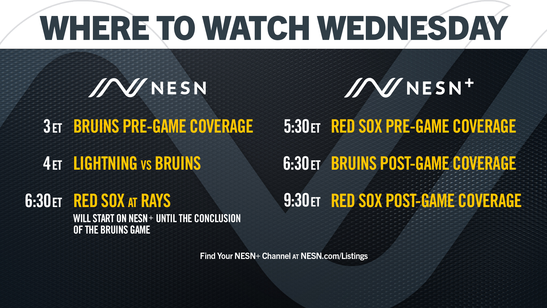 NESN will have live Boston Bruins and Boston Red Sox coverage Wednesday on NESN and NESN+ channels. Bruins coverage will begin at 3 p.m. ET on NESN with an hour-long pre-game show. The Red Sox then will face off against the Tampa Bay Lightning at 4 p.m. on NESN.
